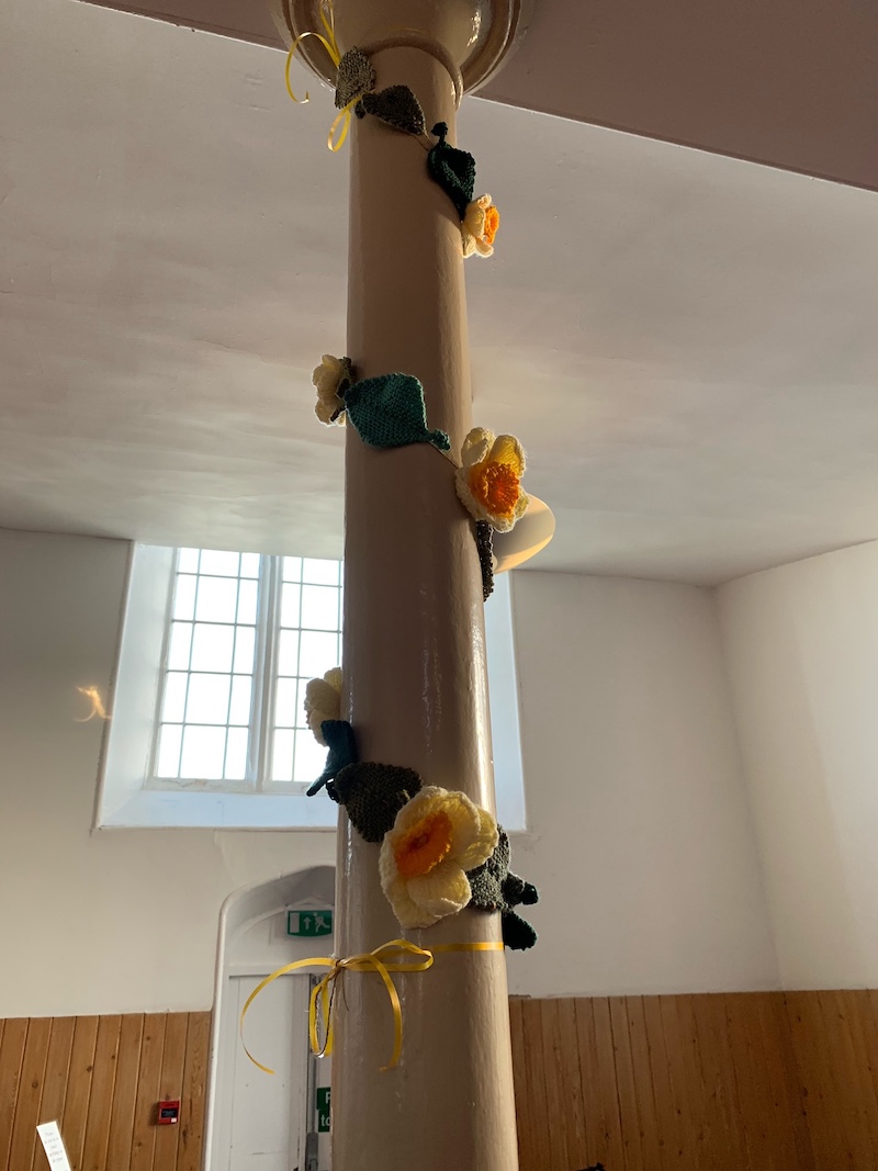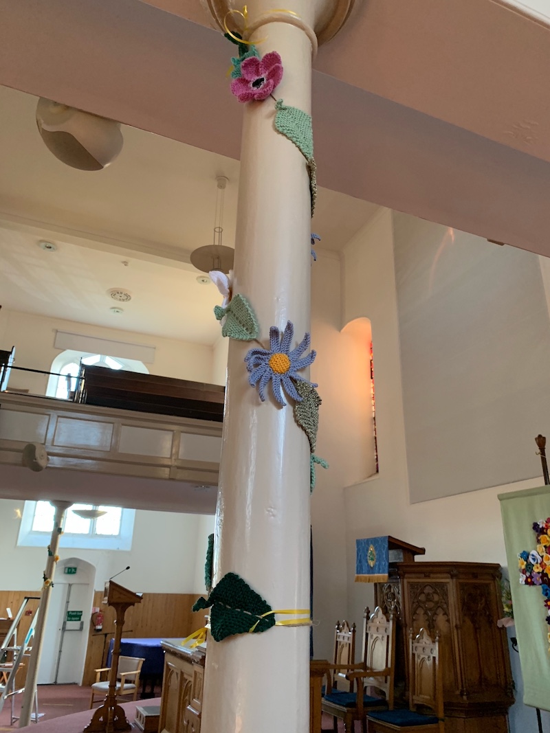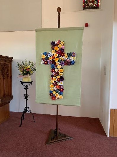 Only 2 weeks before Easter the members of the Craft Group started knitting flowers & leaves. We needed a project! We had no idea what the finished item would be! After the first week the ladies had knitted around 80 flowers and leaves. This is where we were led - a banner with a cross filled with flowers. Thanks to everyone involved this banner was ready for the Easter Morning Service. Well done ladies!